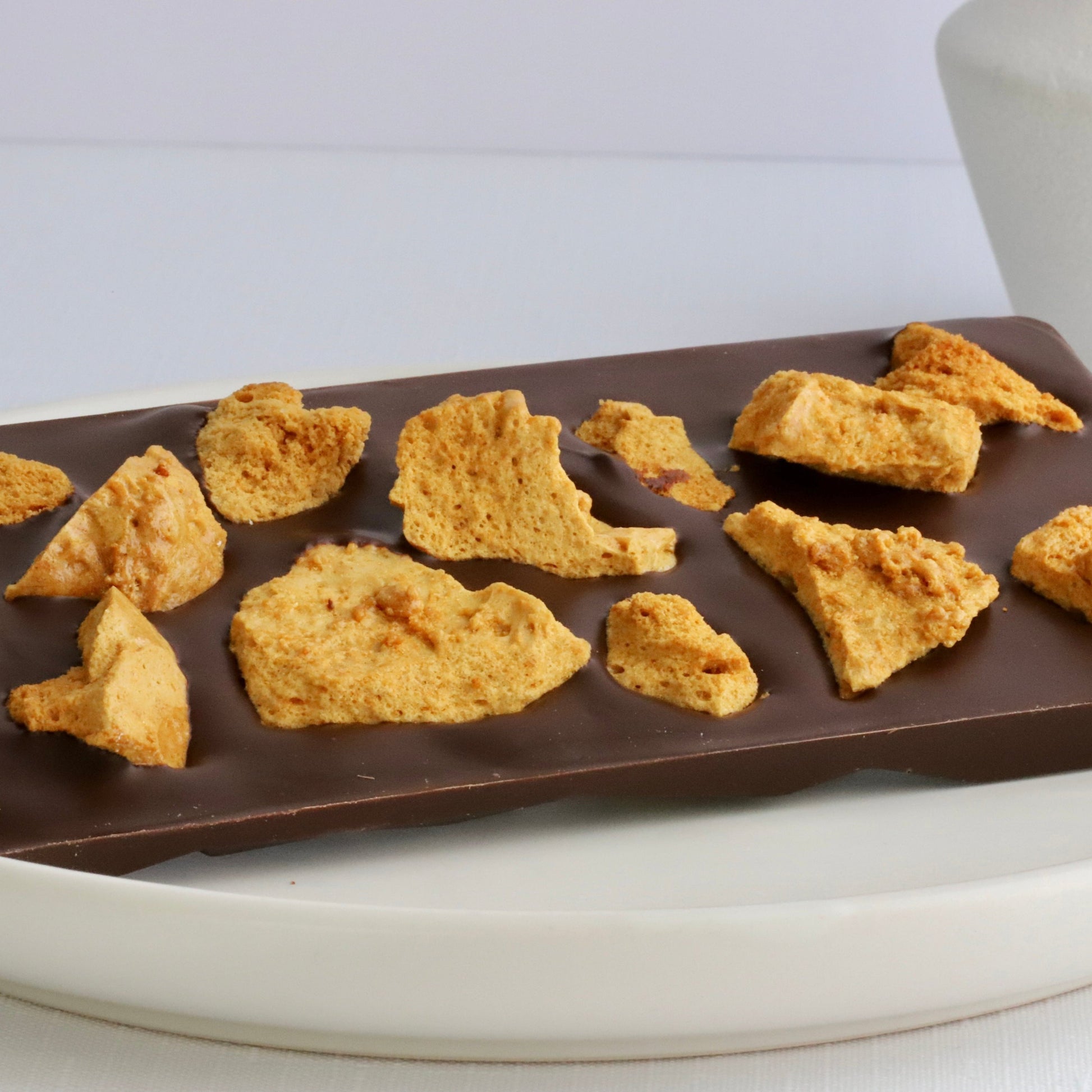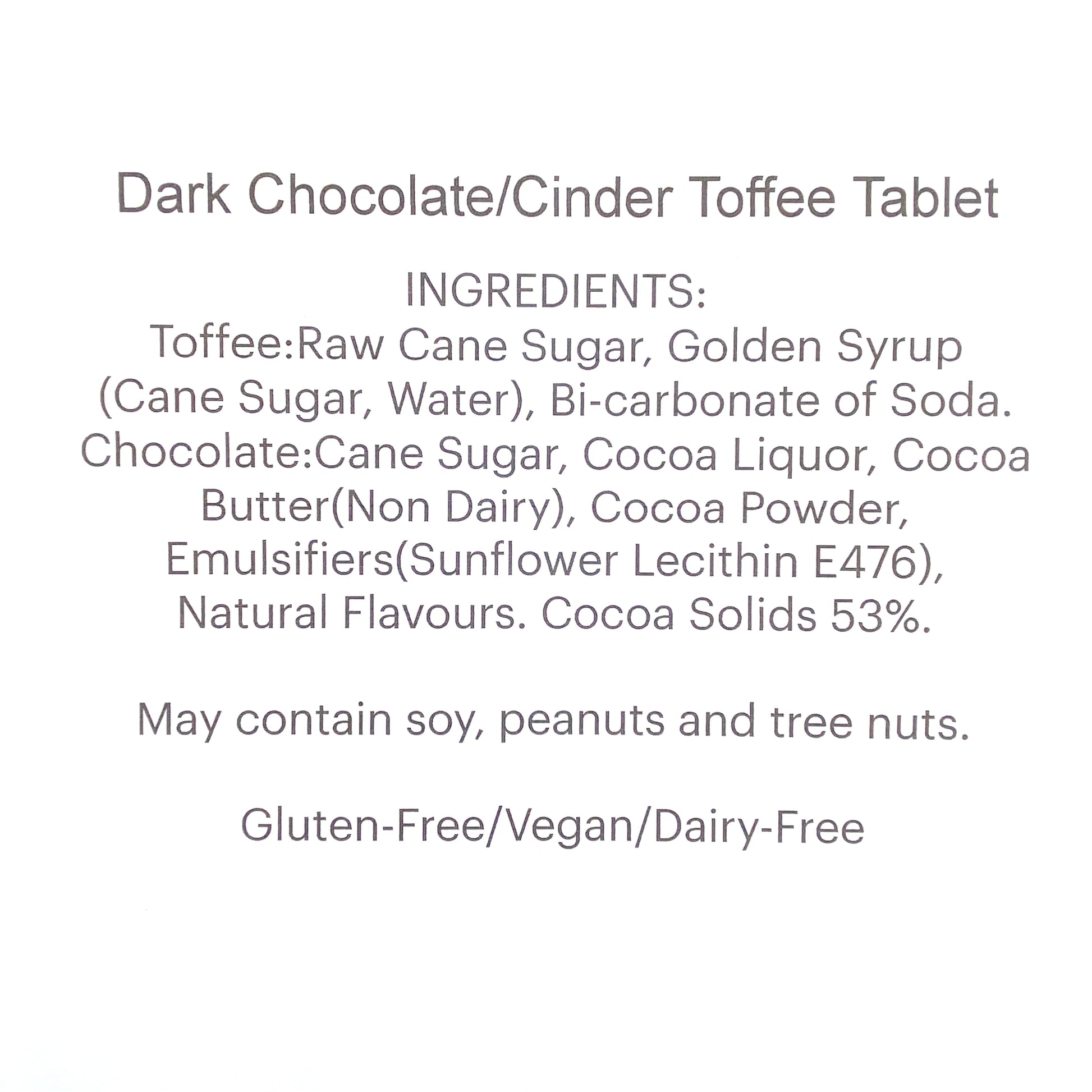 Indulge in the delicious and irresistible taste of our Cinder Toffee Dark Chocolate tablet. Our tablet is a delectable treat that brings together the smooth and velvety flavour of dark chocolate with the satisfying crunch of cinder toffee (Honeycomb) pieces. Made using only premium quality ingredients, crafted to perfection and delivering a premium taste experience that is simply irresistible.