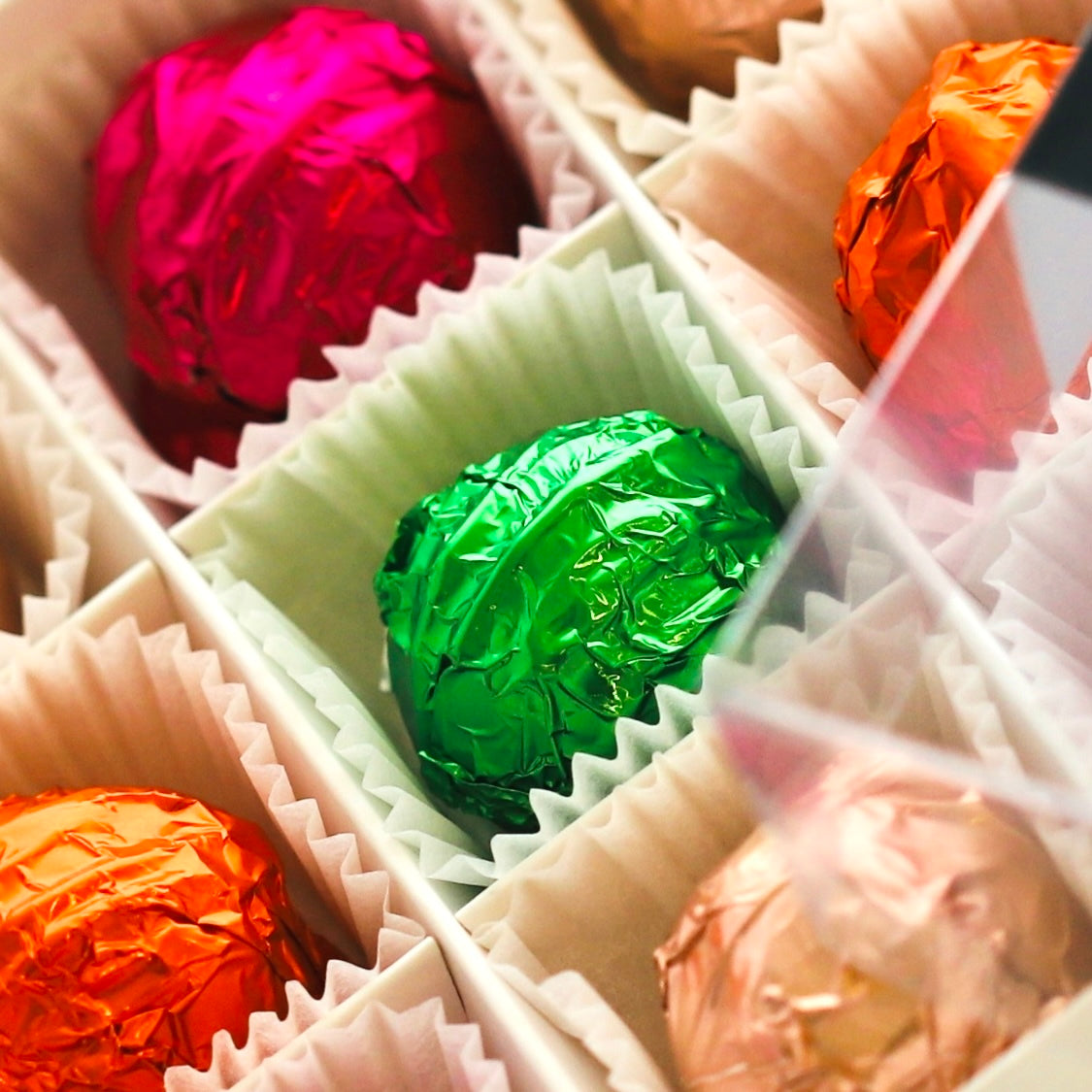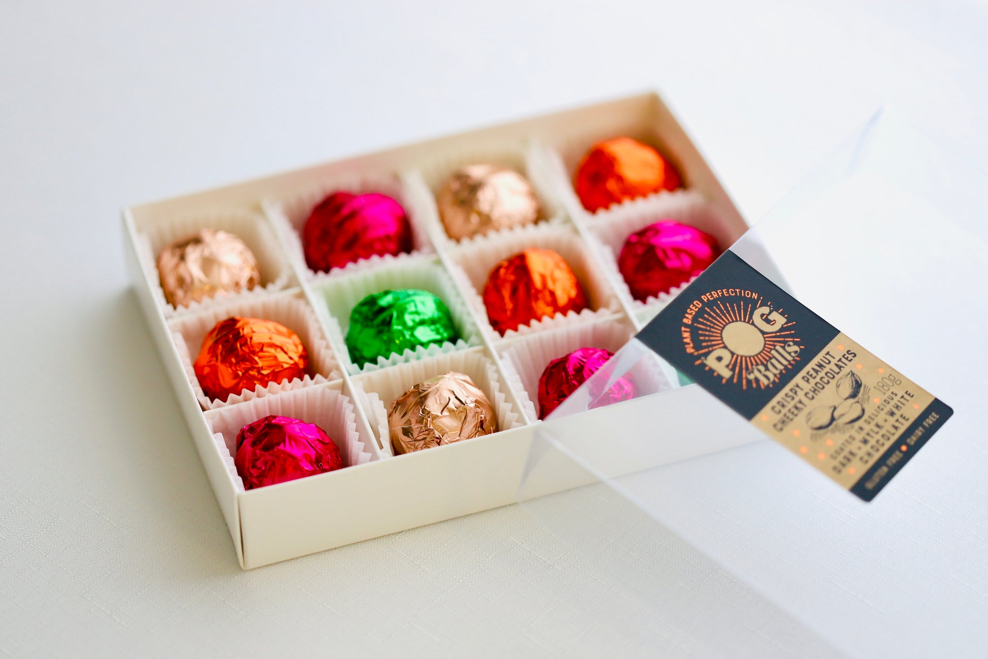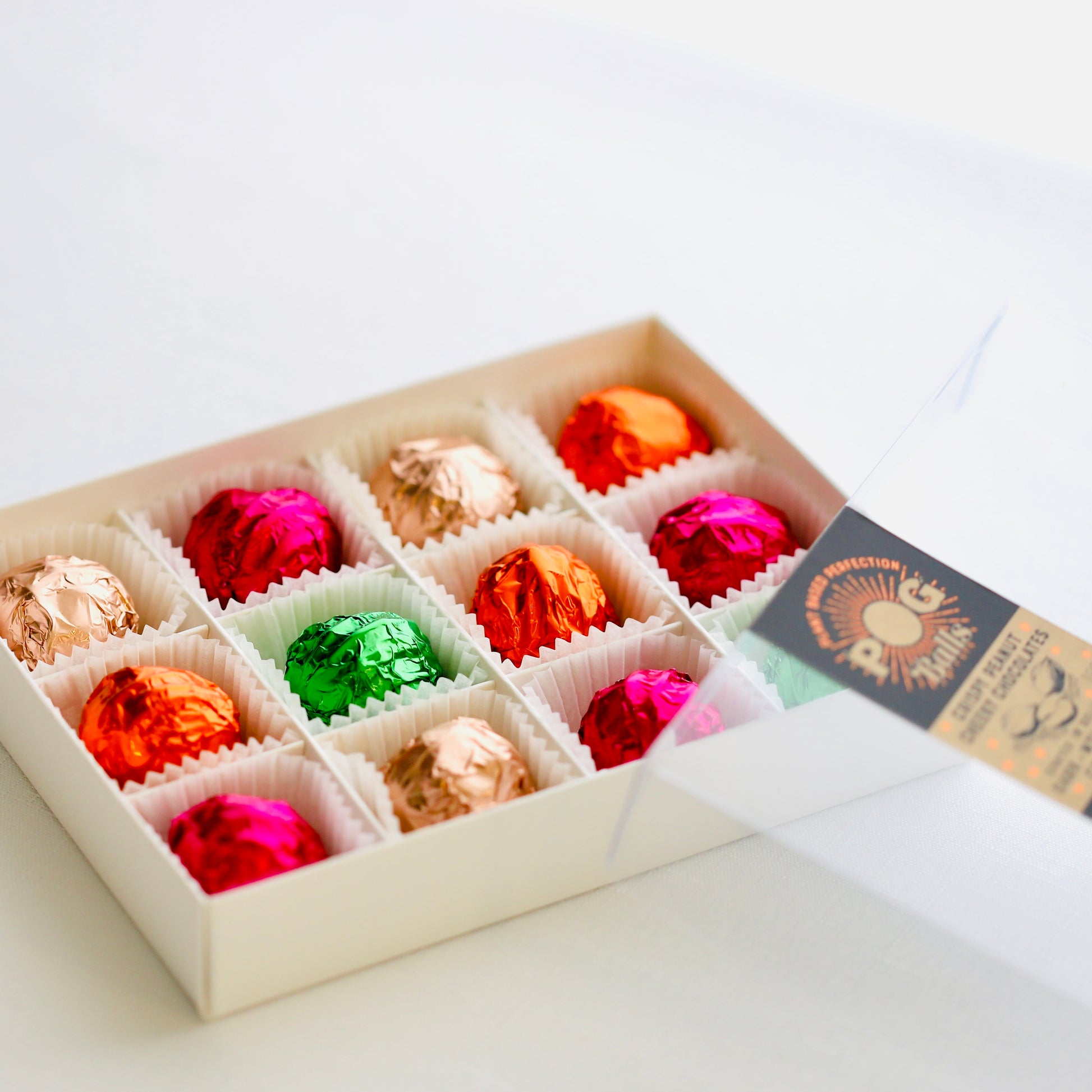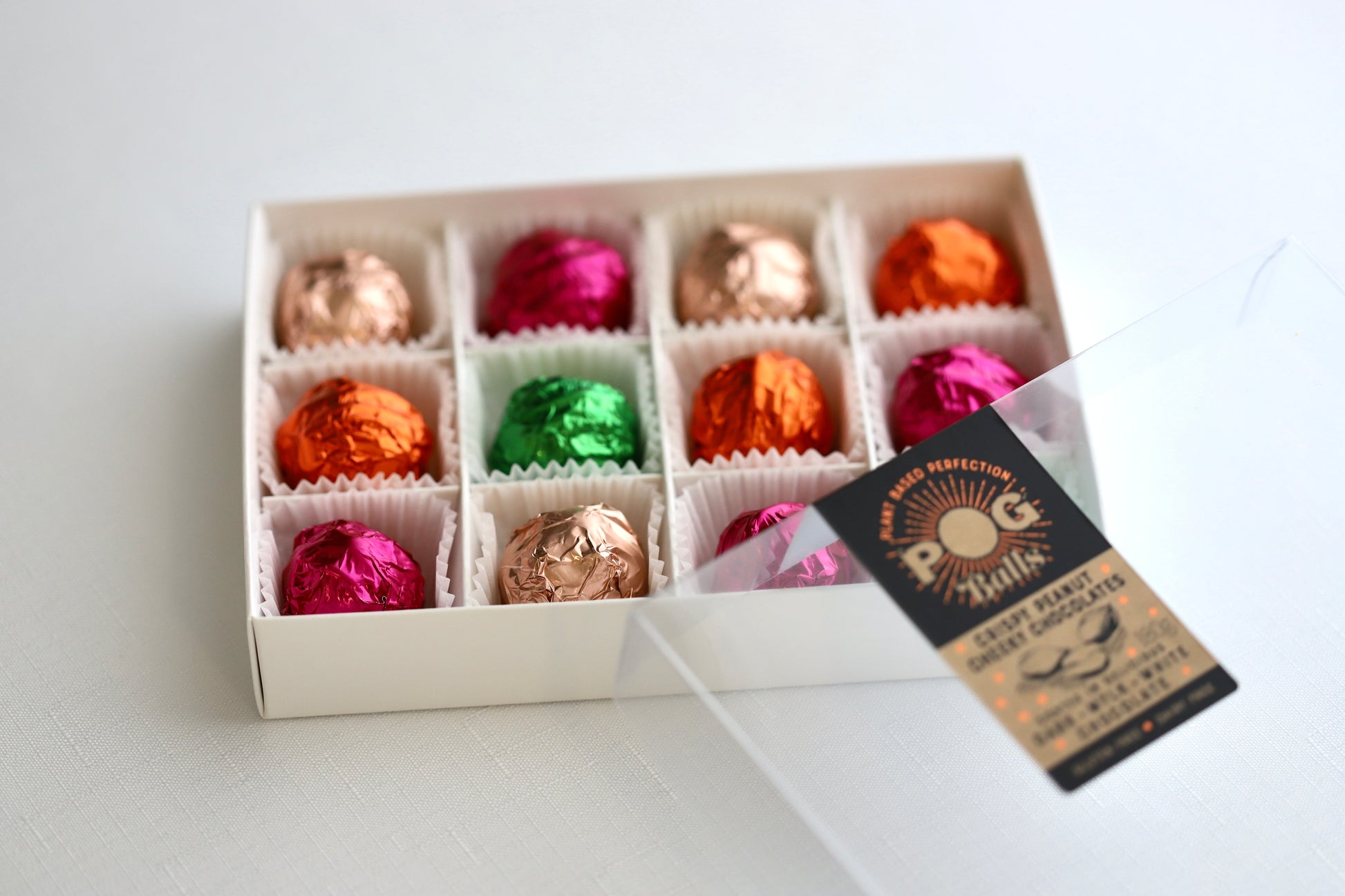 With a box of 12 Colourfully foil-wrapped Pog Balls, you can surprise your loved one or friend with a handmade artisan chocolate gift that they will absolutely love.