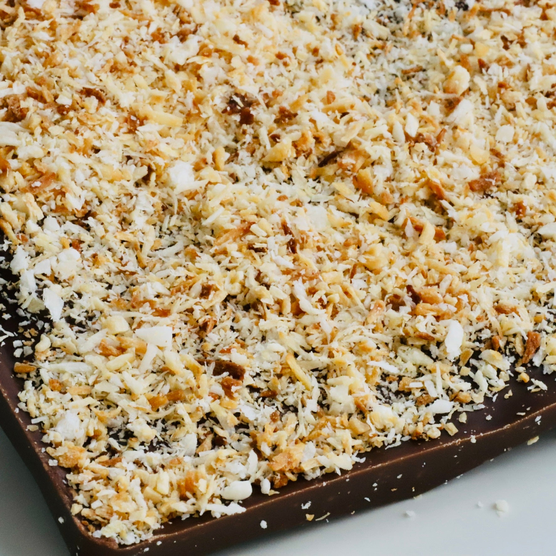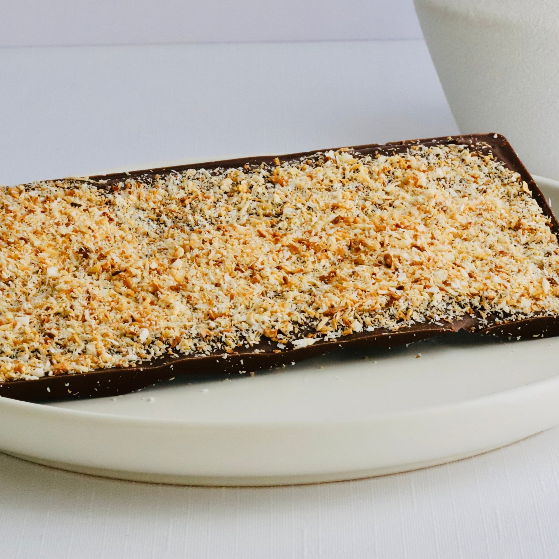 Our Coconut Rough Mylk Chocolate Tablet with toasted coconut pieces is a delicious treat that combines the luxurious taste of mylk chocolate with the crunch and flavour of toasted coconut. This tablet is perfect for sharing with friends or just indulging in a moment of self-care.